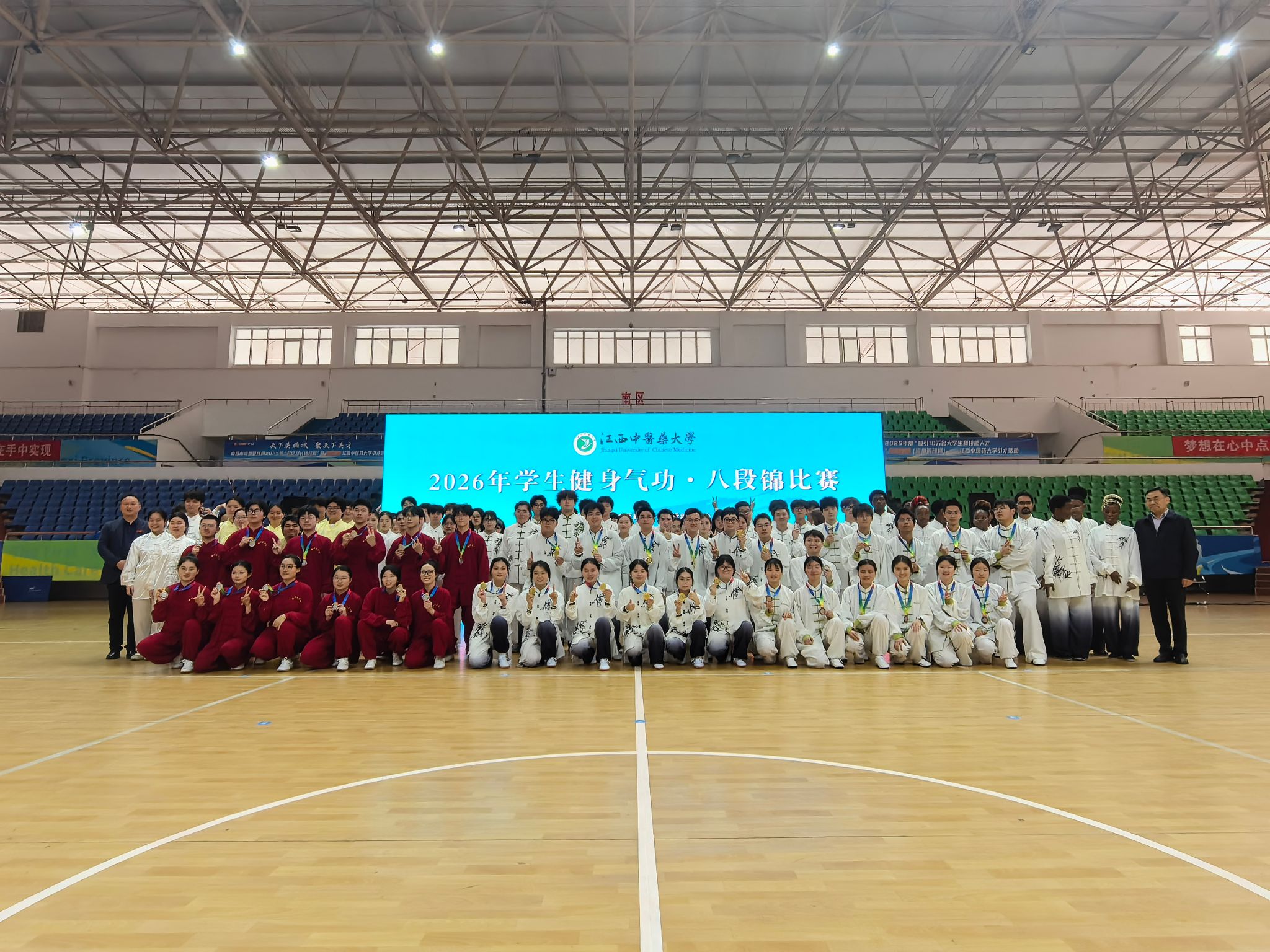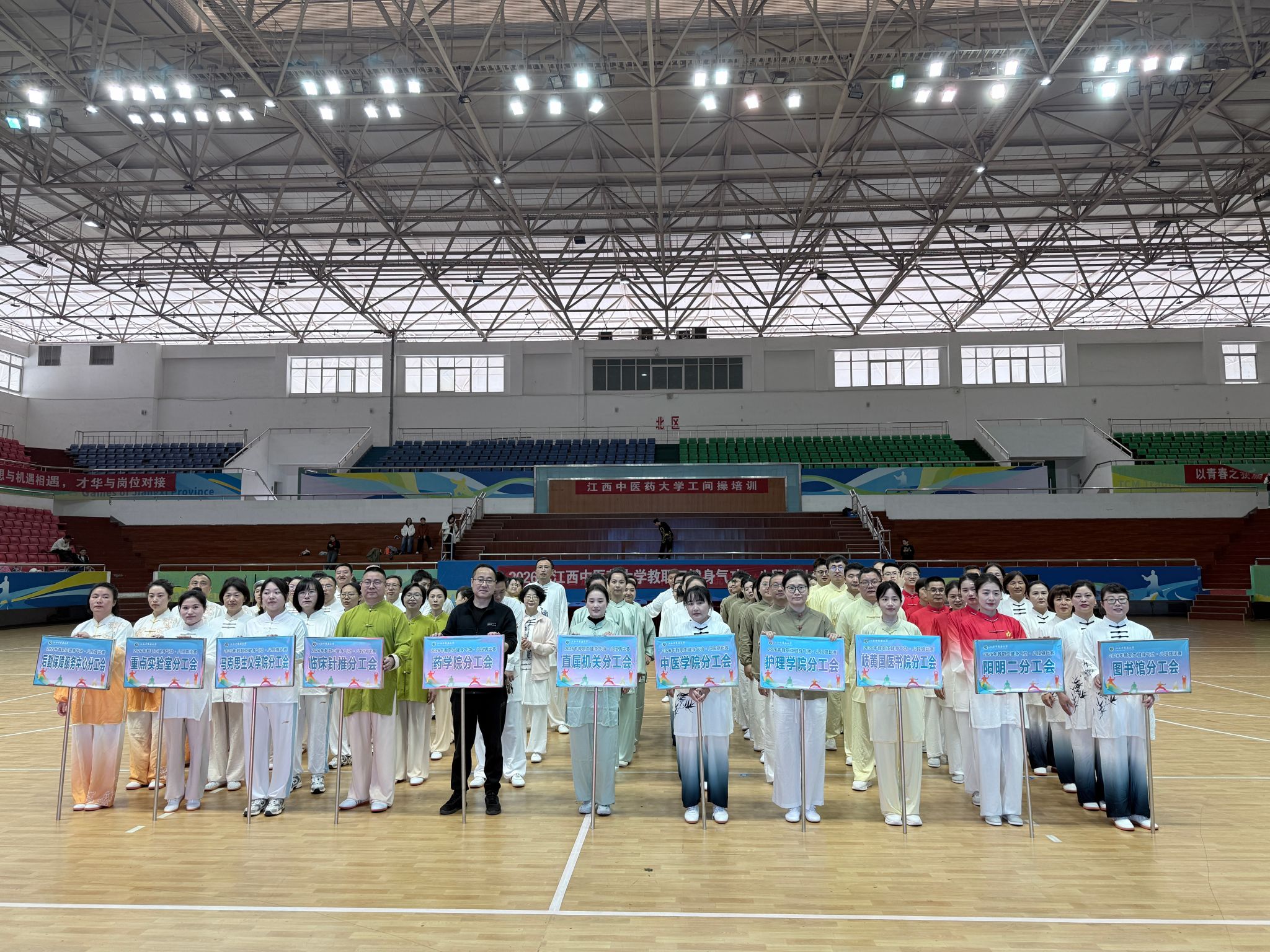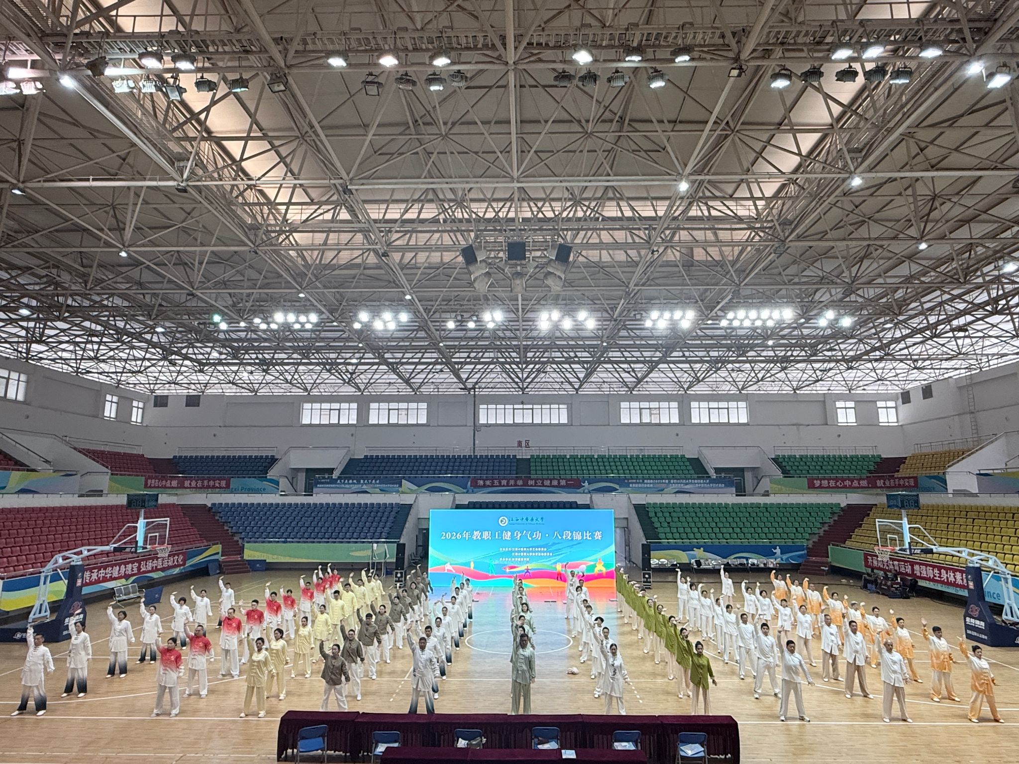 江中新闻网讯(通讯员 黄冬琴)为深入弘扬中华优秀传统文化,扎实践行“五育并举”育人理念,进一步丰富校园体育文化生活,4月24日,由学校体育运动委员会、校工会联合主办,体育健康学院、学生工作处、校团委共同承办的江西中医药大学第三届教工、学生八段锦比赛在学校体育馆顺利开赛。